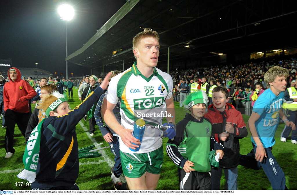 23 October 2010; Ireland's Tommy Walsh gets a pat on the back from a supporter after the game. Irish Daily Mail International Rules Series 1st Test, Ireland v Australia, Gaelic Grounds, Limerick. Picture credit: Diarmuid Greene / SPORTSFILE