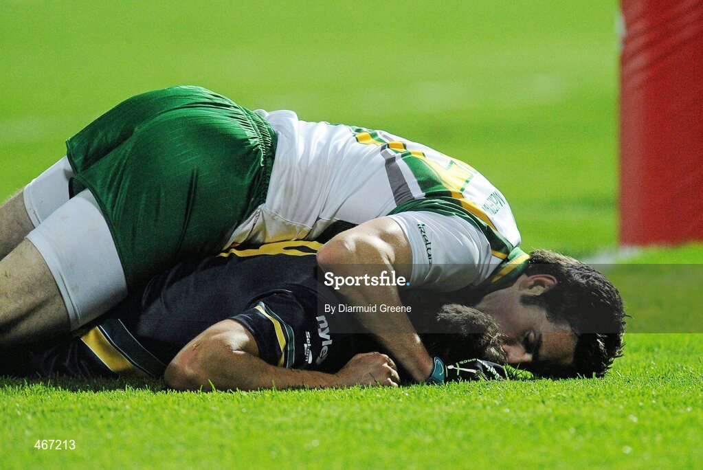 23 October 2010; Kevin McKernan, Ireland, with Garrick Ibbotson, Australia, during the final quarter. Irish Daily Mail International Rules Series 1st Test, Ireland v Australia, Gaelic Grounds, Limerick. Picture credit: Diarmuid Greene / SPORTSFILE