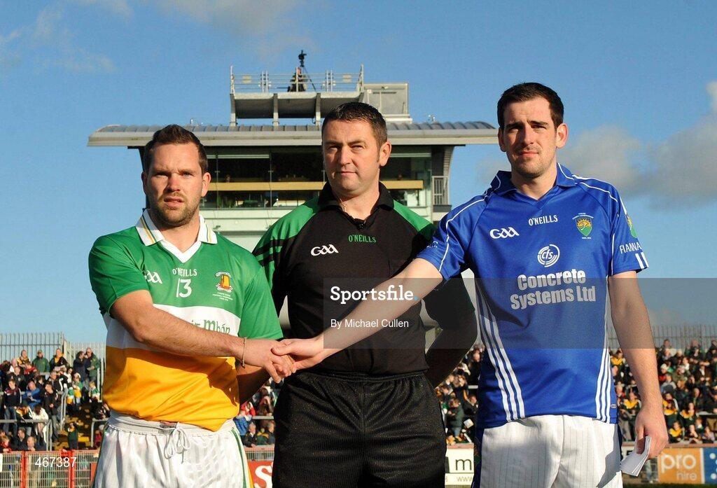 24 September 2010; Coalisland Fianna captain Punkett Kane shakes hands with Carrickmore St Colmcille's captain Kevin McNally and referee Eamonn McHugh. Tyrone County Senior Football Championship Final, Coalisland Fianna v Carrickmore St Colmcille's, Healy Park, Omagh, Co. Tyrone. Picture credit: Michael Cullen / SPORTSFILE