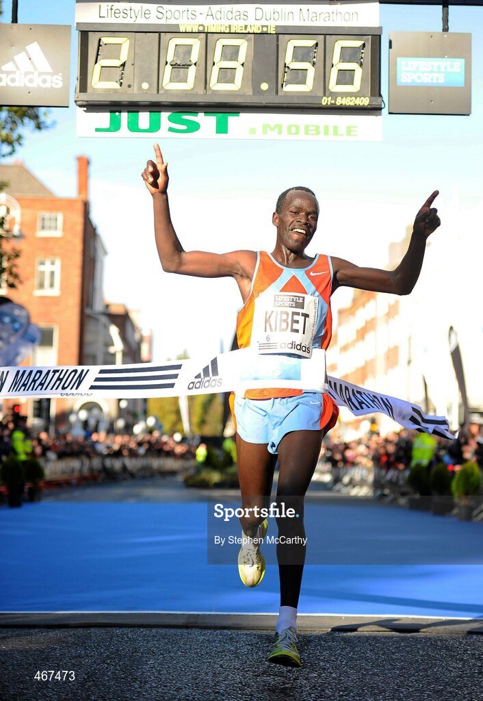 25 October 2010; Moses Kibet, Kenya, celabrates winning the Lifestyle Sports - adidas Dublin Marathon 2010, in a record time of 2 hours 8 minutes and 56 seconds. Dublin. Picture credit: Stephen McCarthy / SPORTSFILE
