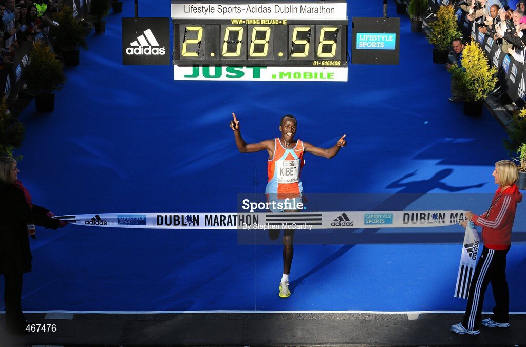 25 October 2010; Moses Kibet, Kenya, celebrates winning the Lifestyle Sports - adidas Dublin Marathon 2010, in a record time of 2 hours 8 minutes and 56 seconds. Dublin. Picture credit: Stephen McCarthy / SPORTSFILE