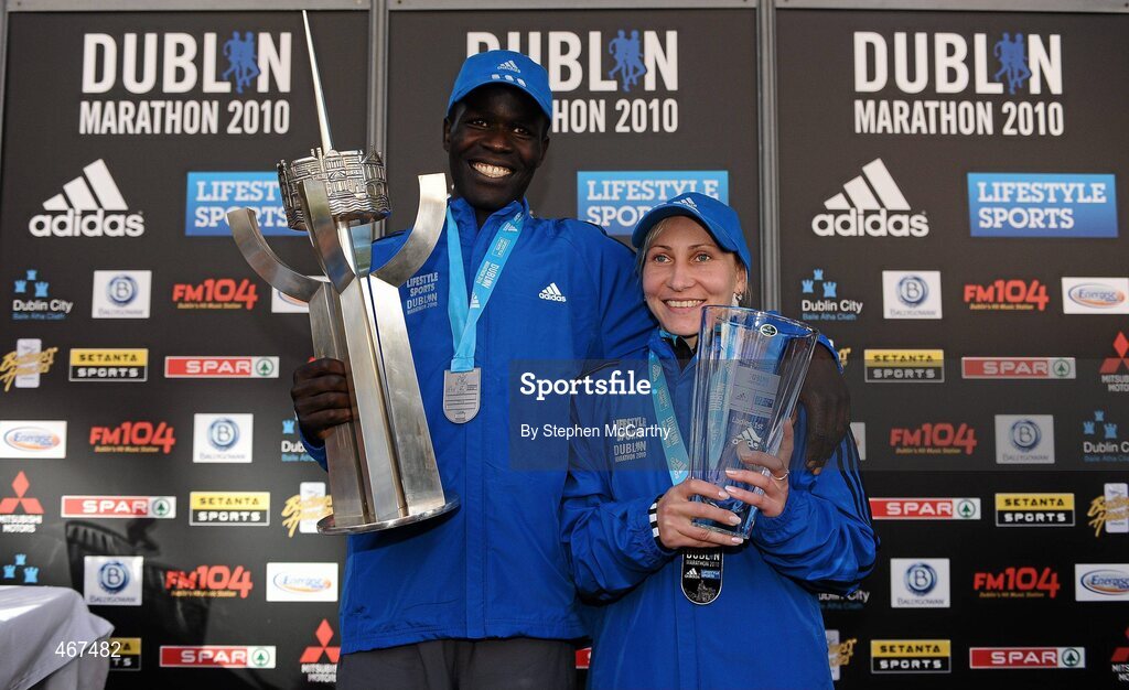 25 October 2010; Mens winner Moses Kangogo Kibet, Kenya, who won in a record time of 2:08:58, and women's winner Tatiana Aryasova, Russia, who won in a record time of 2:26:13, at the Lifestyle Sports - adidas Dublin Marathon 2010. Dublin. Picture credit: Stephen McCarthy / SPORTSFILE