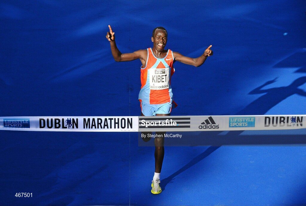 25 October 2010; Moses Kibet, Kenya, celebrates winning the Lifestyle Sports - adidas Dublin Marathon 2010, in a record time of 2 hours 8 minutes and 56 seconds. Dublin. Picture credit: Stephen McCarthy / SPORTSFILE