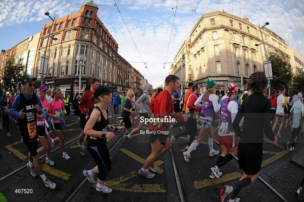 25 October 2010; Competitors cross the Luas lines as they make their way down O'Connell Street during the Lifestyle Sports - adidas Dublin Marathon 2010. Picture credit: Barry Cregg / SPORTSFILE