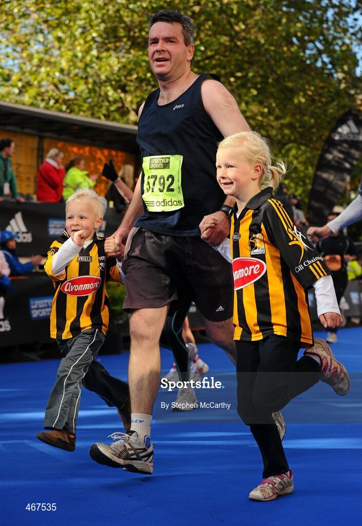 25 October 2010; Colum Sheridan, Kilmacow, Co. Kilkenny, on the approach to the finish line with his children David, age 4, and Rose, age 6, during the Lifestyle Sports - adidas Dublin Marathon 2010. Dublin. Picture credit: Stephen McCarthy / SPORTSFILE