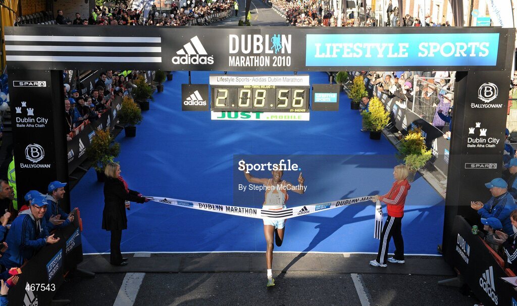 25 October 2010; Moses Kangogo Kibet, Kenya, celebrates winning the Lifestyle Sports - adidas Dublin Marathon 2010, in a record time of 2 hours 8 minutes and 56 seconds. Dublin. Picture credit: Stephen McCarthy / SPORTSFILE