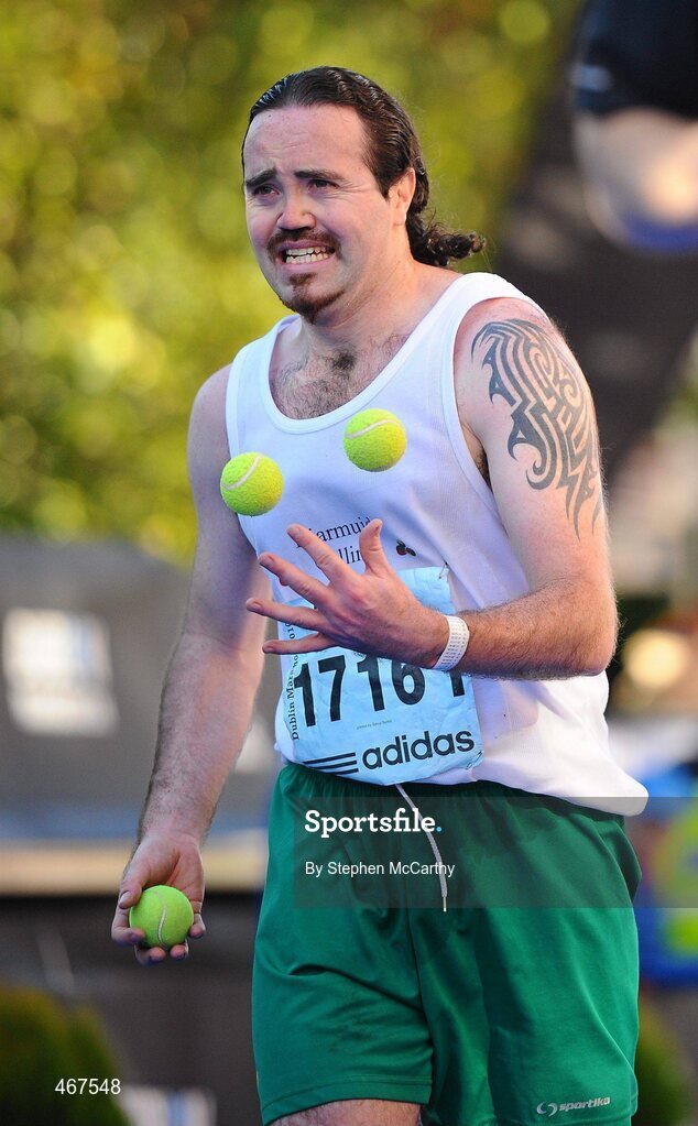 25 October 2010; Diarmuid Collins, from Maynooth, Co. Kildare, juggles tennis balls on the approach to the finish during the Lifestyle Sports - adidas Dublin Marathon 2010. Dublin. Picture credit: Stephen McCarthy / SPORTSFILE