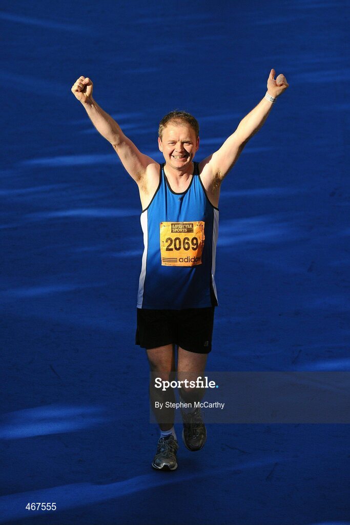 25 October 2010; Damian McCrory, from Omagh, Co. Tyrone, celebrates completing the Lifestyle Sports - adidas Dublin Marathon 2010. Dublin. Picture credit: Stephen McCarthy / SPORTSFILE