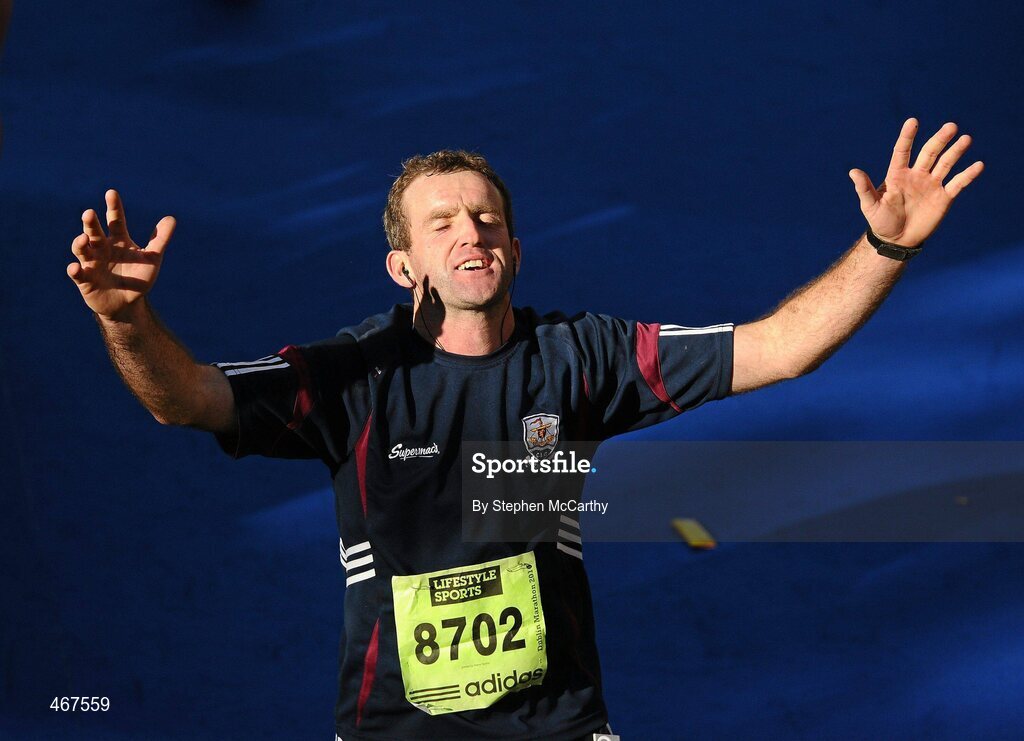 25 October 2010; Andrew Coen, from Gort, Co. Galway, celebrates finishing the Lifestyle Sports - adidas Dublin Marathon 2010. Dublin. Picture credit: Stephen McCarthy / SPORTSFILE