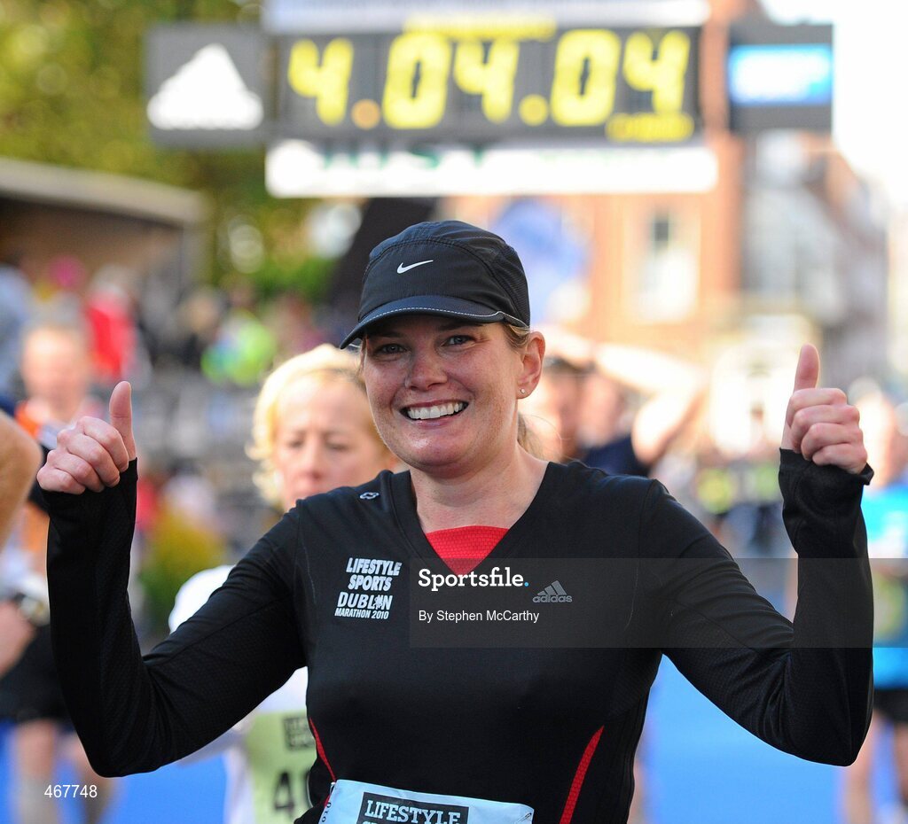 25 October 2010; Sheena Crotty, from Lucan, Dublin, celebrates completing the Lifestyle Sports - adidas Dublin Marathon 2010. Dublin. Picture credit: Stephen McCarthy / SPORTSFILE