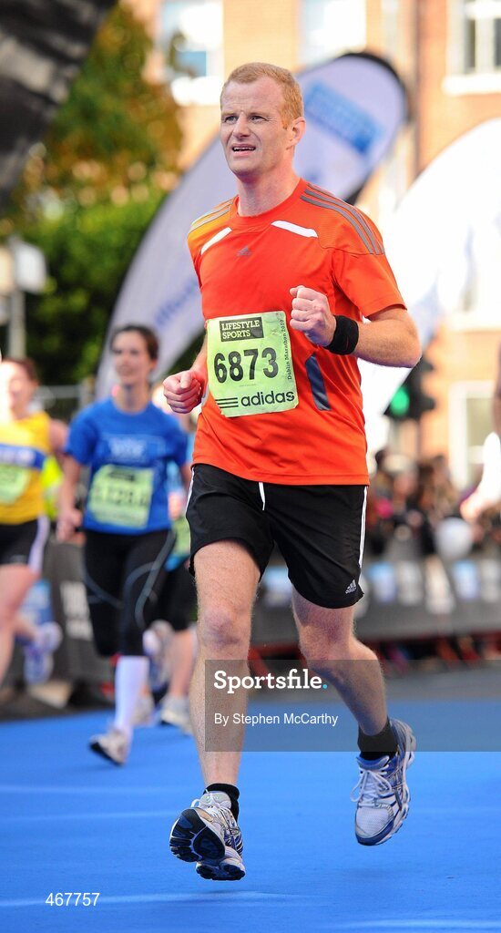 25 October 2010; Pat O'Gorman, from Naas, Co. Kildare, on the approach to the finish during the Lifestyle Sports - adidas Dublin Marathon 2010. Dublin. Picture credit: Stephen McCarthy / SPORTSFILE