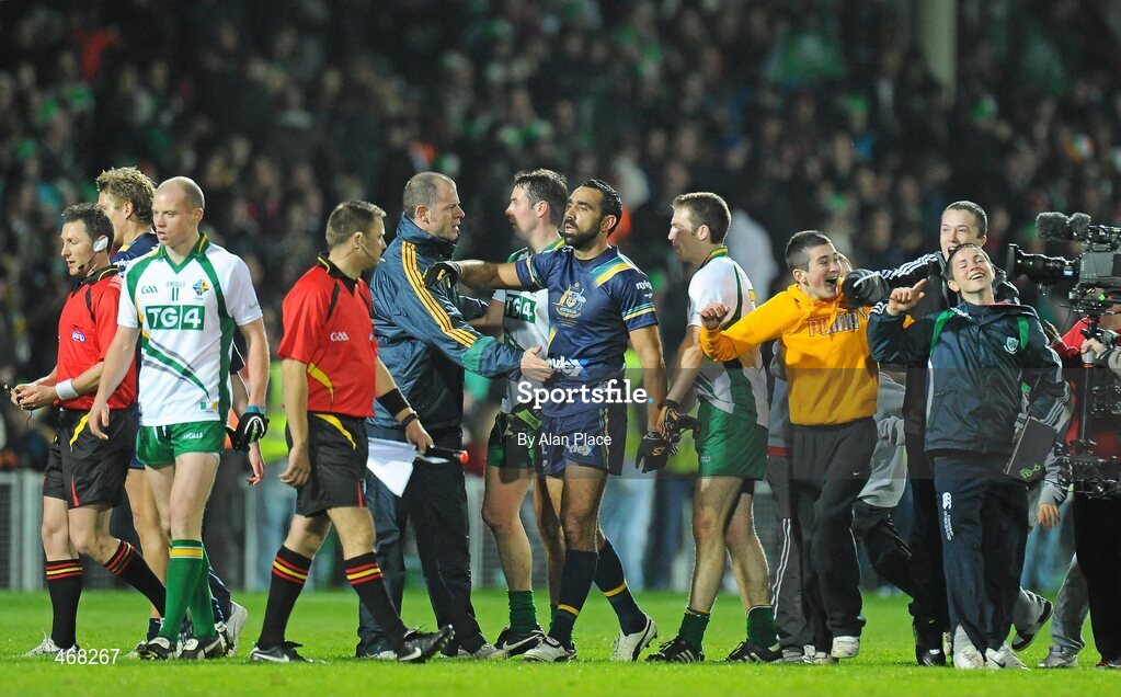 23 October 2010; Ireland head coach Anthony Tohill, congratulates Australia captain Adam Goodes after the game. Irish Daily Mail International Rules Series 1st Test, Ireland v Australia, Gaelic Grounds, Limerick. Picture credit: Alan Place / SPORTSFILE