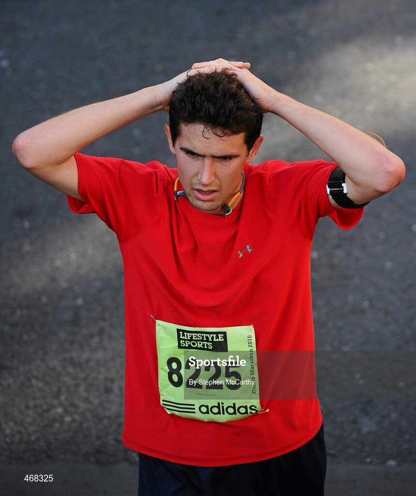 25 October 2010; Andrew Roache, from Edinburgh, Scotland, reacts after completing the Lifestyle Sports - adidas Dublin Marathon 2010. Dublin. Picture credit: Stephen McCarthy / SPORTSFILE