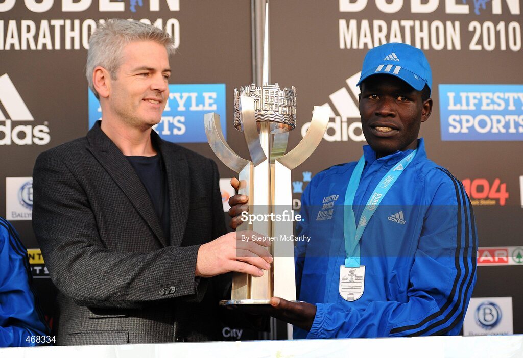 25 October 2010; Mens winner Moses Kangogo Kibet, Kenya, who won in a record time of 2:08:58, is presented with the Noel Carroll perpetual trophy, by Noel Carroll Jnr., at the Lifestyle Sports - adidas Dublin Marathon 2010. Dublin. Picture credit: Stephen McCarthy / SPORTSFILE