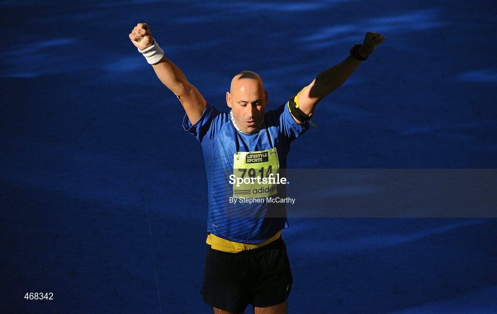 25 October 2010; Diego Fraga, from Spain, celebrates on the approach to the finish of the Lifestyle Sports - adidas Dublin Marathon 2010. Dublin. Picture credit: Stephen McCarthy / SPORTSFILE