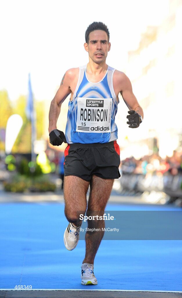25 October 2010; Stuart Robinson, Great Britian, on the approach to the finish during the Lifestyle Sports - adidas Dublin Marathon 2010, where he finished 19th, in a time of 2:24:42. Dublin. Picture credit: Stephen McCarthy / SPORTSFILE