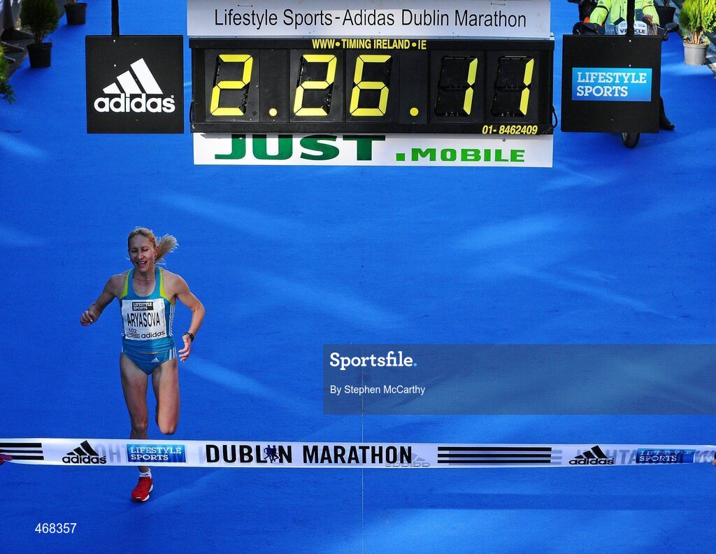 25 October 2010; Winner of the women's race Tatiana Aryasova, from Russia, on the approach to the finish during the Lifestyle Sports - adidas Dublin Marathon 2010, where she finished in a record time of 2:26:13. Dublin. Picture credit: Stephen McCarthy / SPORTSFILE