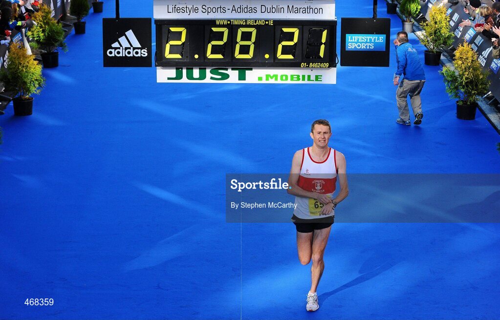 25 October 2010; Matthew Bidwell, from ClareGalway, Co. Galway, finishes the Lifestyle Sports - adidas Dublin Marathon 2010. Dublin. Picture credit: Stephen McCarthy / SPORTSFILE