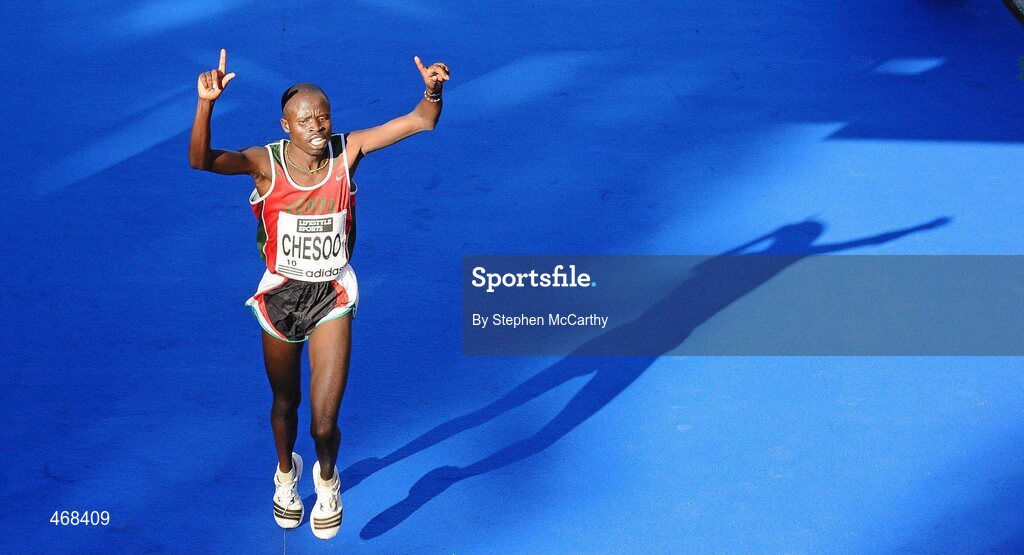 25 October 2010; Chesoo Jonath Kipchirchir, Kenya, celebrates taking fourth place during the Lifestyle Sports - adidas Dublin Marathon 2010. Dublin. Picture credit: Stephen McCarthy / SPORTSFILE