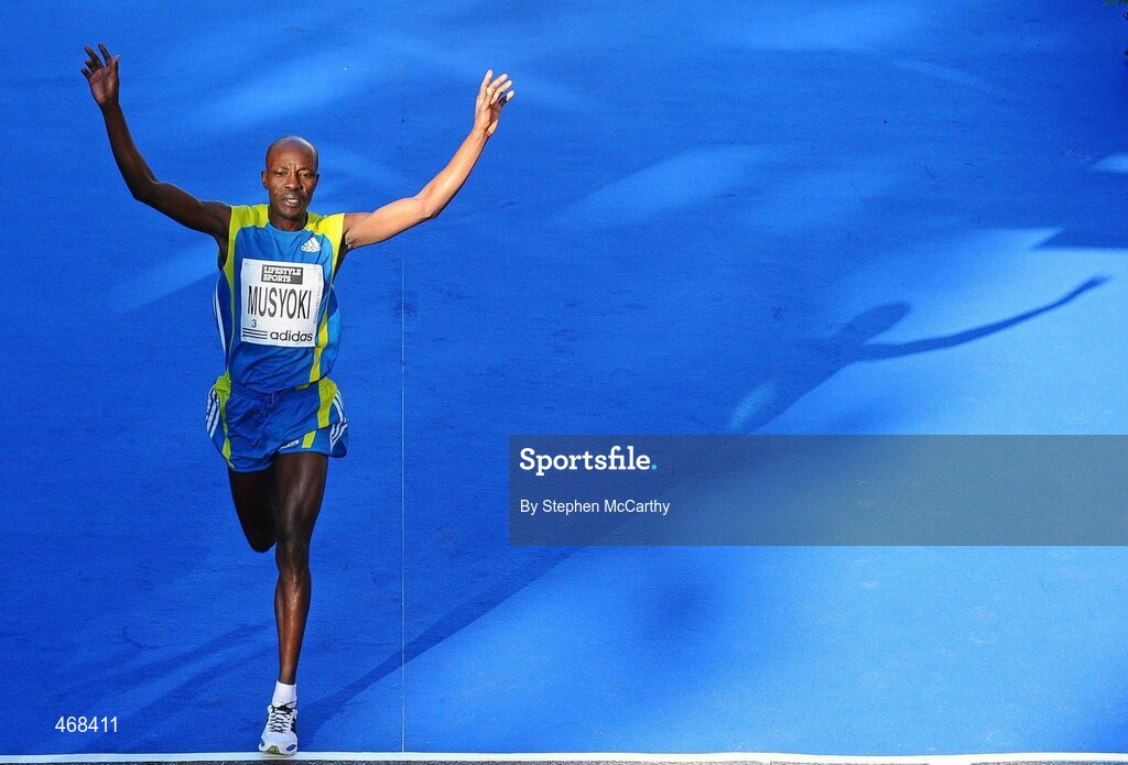 25 October 2010; Mourice Mutinda Musyoki, from Kenya, celebrates taking third place during the Lifestyle Sports - adidas Dublin Marathon 2010. Dublin. Picture credit: Stephen McCarthy / SPORTSFILE