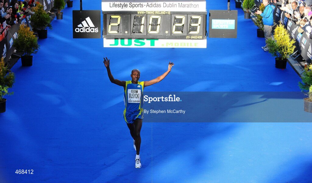 25 October 2010; Mourice Mutinda Musyoki, from Kenya, celebrates taking third place during the Lifestyle Sports - adidas Dublin Marathon 2010. Dublin. Picture credit: Stephen McCarthy / SPORTSFILE