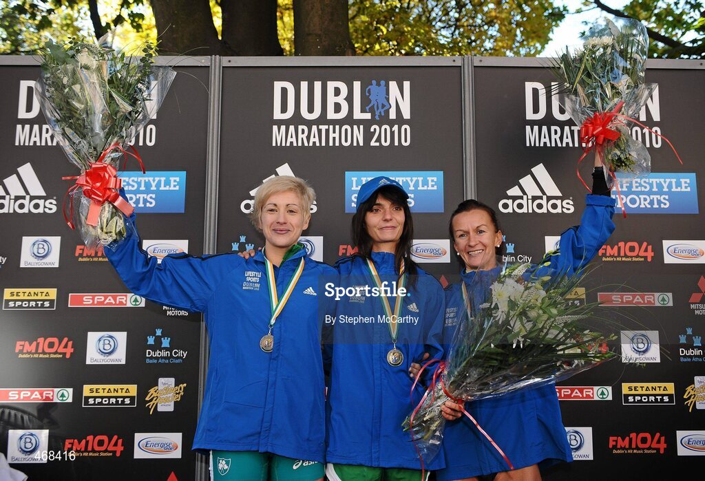 25 October 2010; Women's Irish National Marathon Championships winner Barbara Sanchez, Raheny Shamrock A.C., centre, with second place Pauline Curley, Marathon Mission, right, and Lorraine Manning, Raheny Shamrock A.C., during the Lifestyle Sports - adidas Dublin Marathon 2010. Dublin. Picture credit: Stephen McCarthy / SPORTSFILE