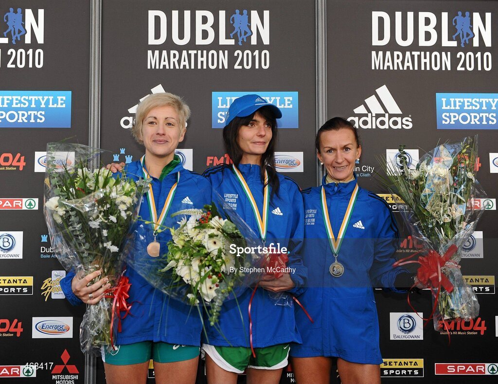 25 October 2010; Women's Irish National Marathon Championships winner Barbara Sanchez, Raheny Shamrock A.C., centre, with second place Pauline Curley, Marathon Mission, right, and Lorraine Manning, Raheny Shamrock A.C., during the Lifestyle Sports - adidas Dublin Marathon 2010. Dublin. Picture credit: Stephen McCarthy / SPORTSFILE