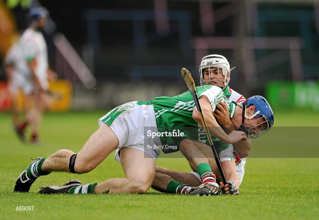 31 October 2010; Brian Hogan, left, O'Loughlin Gaels, tussles with Alan Delaney, Rathdowney/Errill, off the ball. AIB GAA Hurling Leinster Club Senior Championship Quarter-Final, Rathdowney/Errill v O'Loughlin Gaels, O'Moore Park, Portlaoise, Co. Laois. Picture credit: Barry Cregg / SPORTSFILE