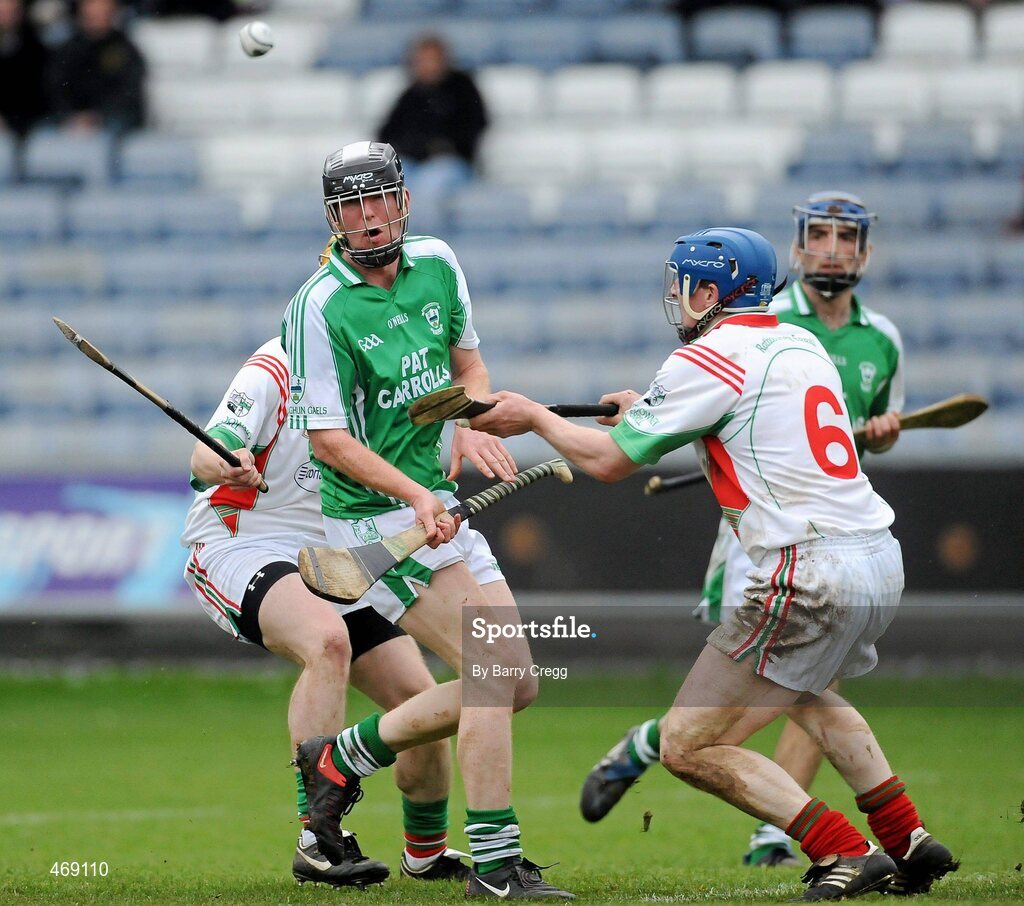 31 October 2010; Sheamie Cummins, O'Loughlin Gaels, in action against James Corrigan, left, and Pat Mahon, Rathdowney/Errill. AIB GAA Hurling Leinster Club Senior Championship Quarter-Final, Rathdowney/Errill v O'Loughlin Gaels, O'Moore Park, Portlaoise, Co. Laois. Picture credit: Barry Cregg / SPORTSFILE