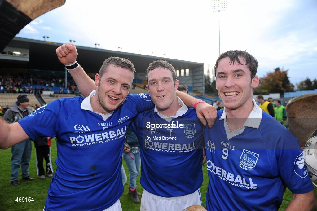 31 October 2010; Thurles Sarsfields players from left David Kennedy, Michael Cahill and Michael Gleeson celebrate after the final whistle. Tipperary County Senior Hurling Championship Final, Thurles Sarsfields v Clonoulty / Rossmore, Semple Stadium, Thurles, Co. Tipperary. Picture credit: Matt Browne / SPORTSFILE