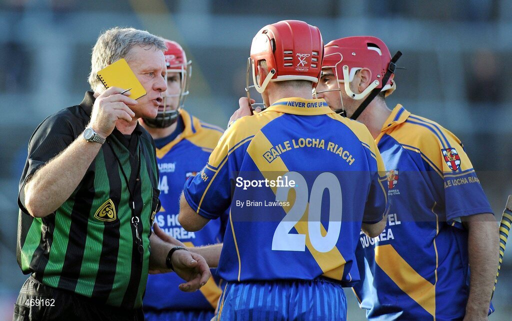 31 October 2010; Referee Michael Dolan issues Tom Regan, Loughrea, with a yellow card. Galway County Senior Hurling Championship Final, Clarinbridge v Loughrea, Pearse Stadium, Galway. Picture credit: Brian Lawless / SPORTSFILE