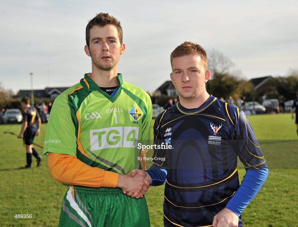 30 October 2010; Ireland captain Eoin Reilly, left, and Scotland captain Michael Rodger before the game. U21 Shinty - Hurling International Final, Ireland v Scotland, Ratoath GAA Club, Ratoath, Co. Meath. Picture credit: Barry Cregg / SPORTSFILE