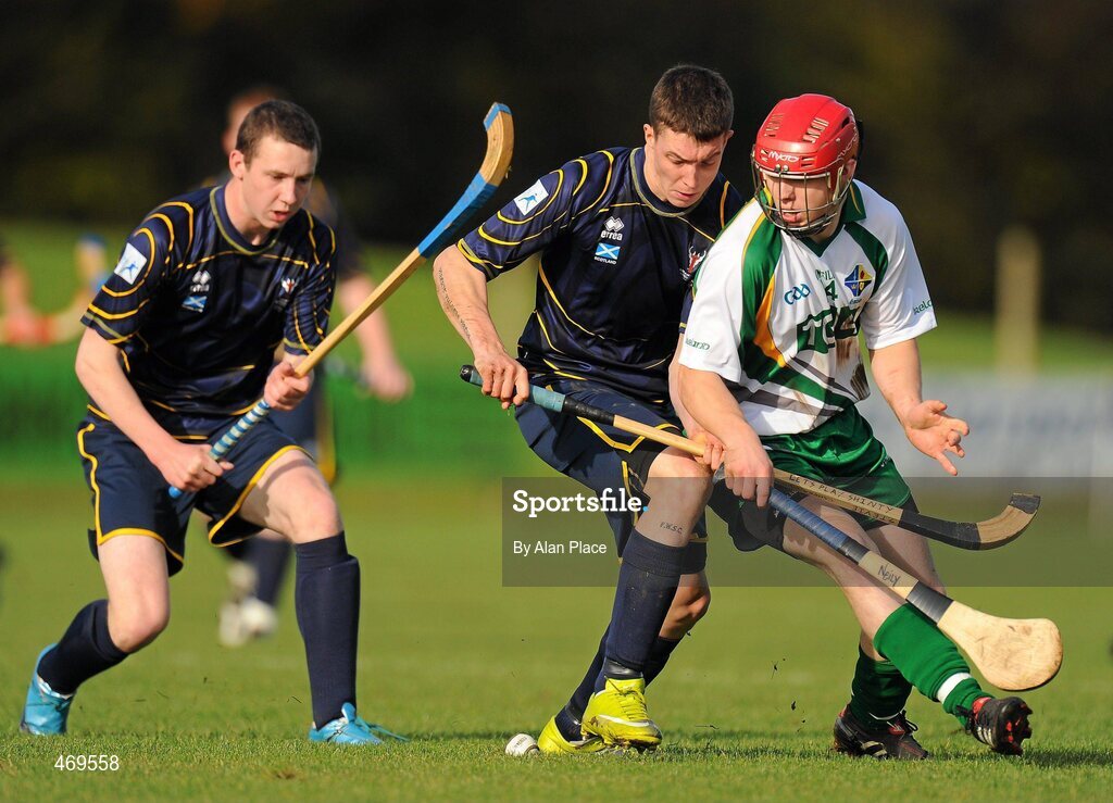 30 October 2010; Neil Heffernan, Ireland, in action against Rory Kennedy and Stevie Stewart, Scotland. U21 Shinty - Hurling International Final, Ireland v Scotland, Ratoath GAA Club, Ratoath, Co. Meath. Picture credit: Alan Place / SPORTSFILE