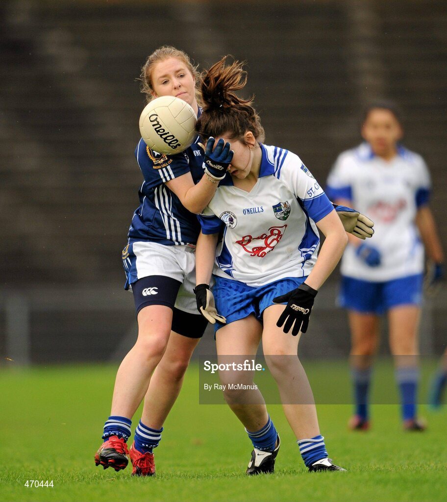 6 November 2010; Sarah Haughey, left, St Gall’s, Antrim, in action against Niamh Cullen, St Conleth’s, Laois. Tesco All-Ireland Intermediate Ladies Football Club Championship Semi-Final, St Gall’s, Antrim v St Conleth’s, Laois, Casement Park, Belfast, Co. Antrim. Picture credit: Ray McManus / SPORTSFILE
