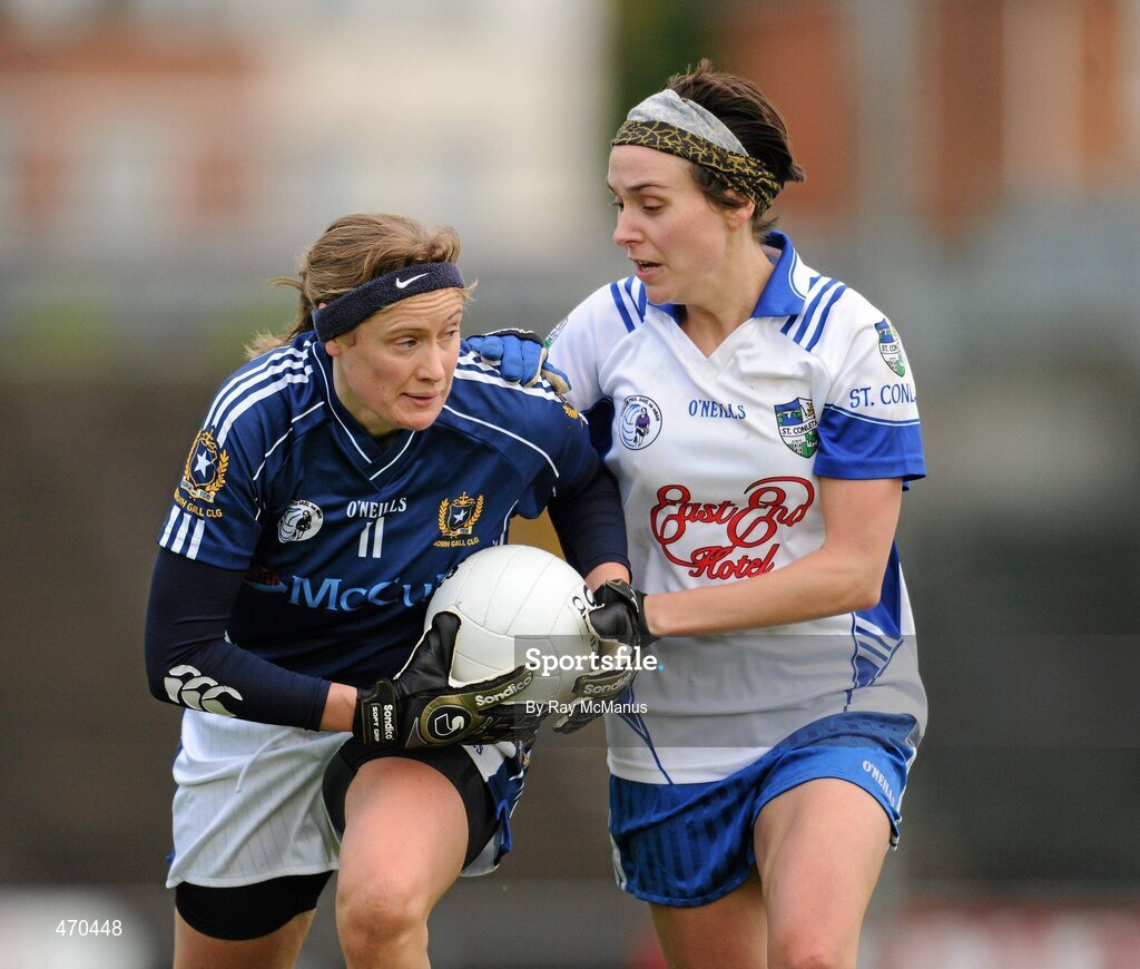 6 November 2010; Ciara Ferry, St Gall’s, Antrim, is tackled by LInda-Gene Finn, St Conleth’s, Laois. Tesco All-Ireland Intermediate Ladies Football Club Championship Semi-Final, St Gall’s, Antrim v St Conleth’s, Laois, Casement Park, Belfast, Co. Antrim. Picture credit: Ray McManus / SPORTSFILE