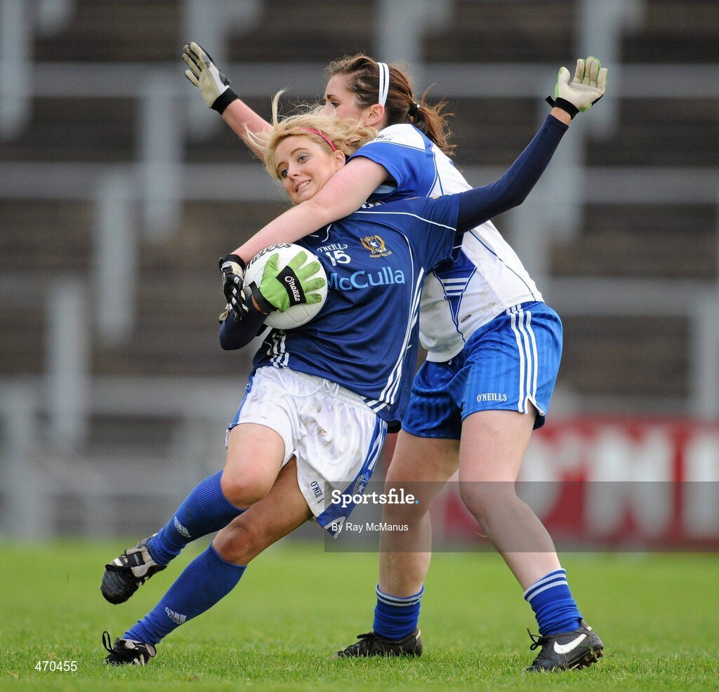 6 November 2010; Maorisa McGourty, St Gall’s, Antrim, is tackled by Rachel Gorman, St Conleth’s, Laois. Tesco All-Ireland Intermediate Ladies Football Club Championship Semi-Final, St Gall’s, Antrim v St Conleth’s, Laois, Casement Park, Belfast, Co. Antrim. Picture credit: Ray McManus / SPORTSFILE
