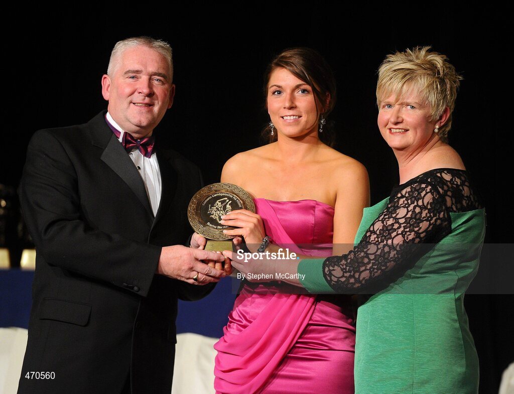 6 November 2010; Rhona Torney, Antrim, is presented with her 2010 Camogie Soaring Star award by Cormac Farrell, Marketing Director, O'Neills, and President of the Camogie Association Joan O' Flynn at the 2010 Camogie All-Stars in association with O’Neills. Citywest Hotel, Saggart, Co. Dublin. Picture credit: Stephen McCarthy / SPORTSFILE