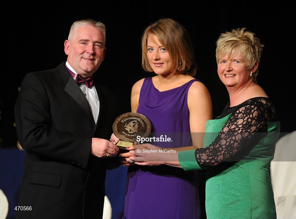 6 November 2010; Patrica Jackman, Waterford, is presented with her 2010 Camogie Soaring Star award by Cormac Farrell, Marketing Director, O'Neills, and President of the Camogie Association Joan O' Flynn at the 2010 Camogie All-Stars in association with O’Neills. Citywest Hotel, Saggart, Co. Dublin. Picture credit: Stephen McCarthy / SPORTSFILE