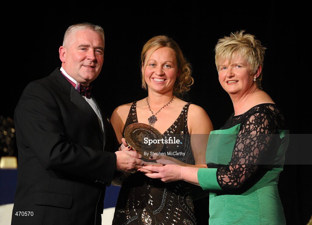 6 November 2010; Kerrie O'Neill, Antrim, is presented with her 2010 Camogie Soaring Star award by Cormac Farrell, Marketing Director, O'Neills, and President of the Camogie Association Joan O' Flynn at the 2010 Camogie All-Stars in association with O’Neills. Citywest Hotel, Saggart, Co. Dublin. Picture credit: Stephen McCarthy / SPORTSFILE