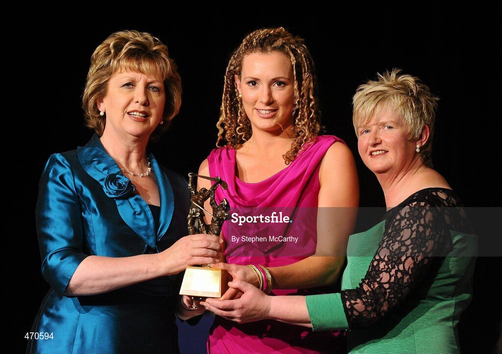 6 November 2010; Aislinn Connolly, Galway, is presented with her 2010 Camogie All-Star award by President Mary McAleese and President of the Camogie Association Joan O' Flynn at the 2010 Camogie All-Stars in association with O’Neills. Citywest Hotel, Saggart, Co. Dublin. Picture credit: Stephen McCarthy / SPORTSFILE