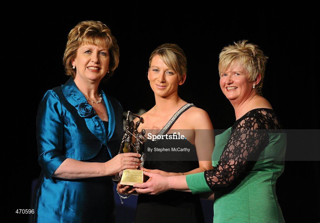 6 November 2010; Orla Kilkenny, Galway, is presented with her 2010 Camogie All-Star award by President Mary McAleese and President of the Camogie Association Joan O' Flynn at the 2010 Camogie All-Stars in association with O’Neills. Citywest Hotel, Saggart, Co. Dublin. Picture credit: Stephen McCarthy / SPORTSFILE