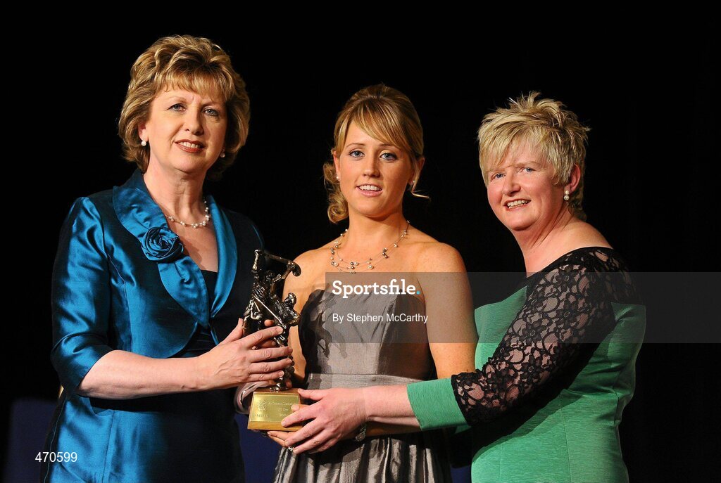 6 November 2010; Regina Glynn, Galway, is presented with her 2010 Camogie All-Star award by President Mary McAleese and President of the Camogie Association Joan O' Flynn at the 2010 Camogie All-Stars in association with O’Neills. Citywest Hotel, Saggart, Co. Dublin. Picture credit: Stephen McCarthy / SPORTSFILE