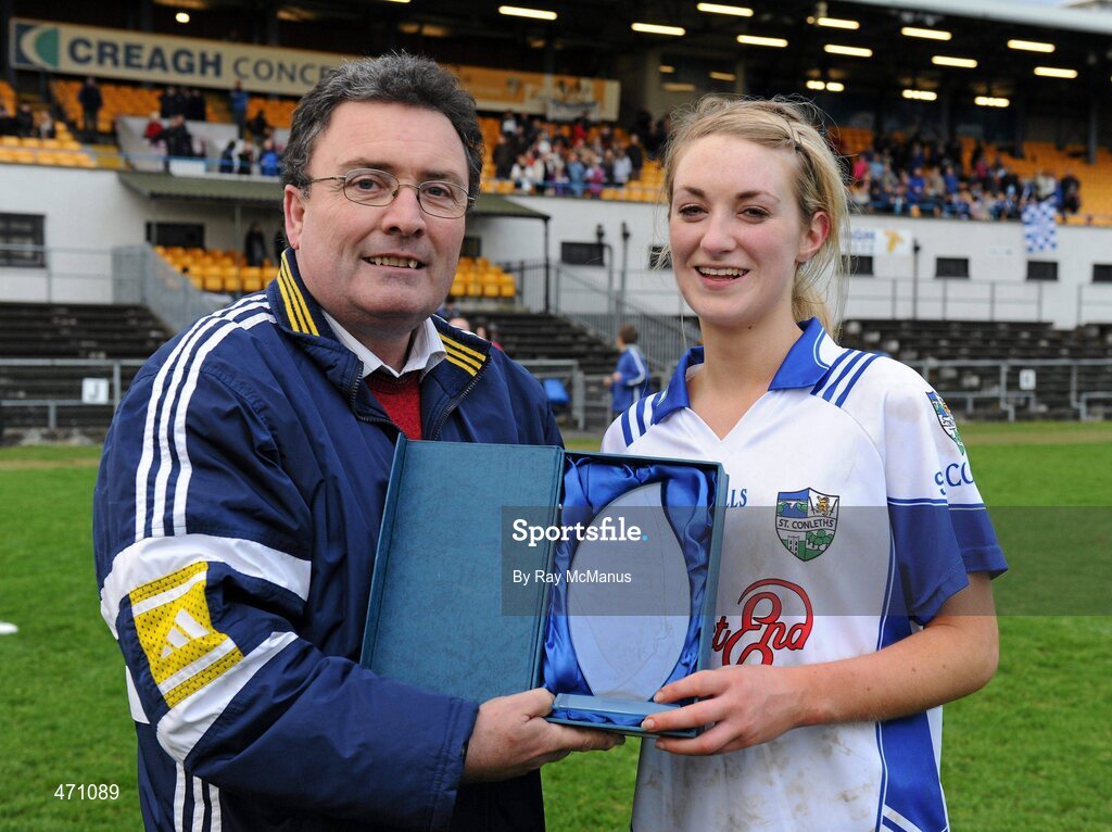 6 November 2010; Gerry Doherty, Ulster Ladies GAA, presents Aimee Kelly, St Conleth’s, Laois, with the player of the match award. Tesco All-Ireland Intermediate Ladies Football Club Championship Semi-Final, St Gall’s, Antrim v St Conleth’s, Laois, Casement Park, Belfast, Co. Antrim. Picture credit: Ray McManus / SPORTSFILE