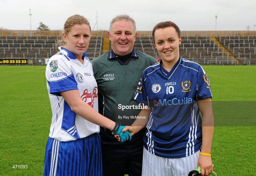 6 November 2010; Referee Terense McShea with St Conleth’s, Laois, captain Claire O'Connell and St. Gall’s, Antrim, captain Eimear Gallagher ahead of the game. Tesco All-Ireland Intermediate Ladies Football Club Championship Semi-Final, St Gall’s, Antrim v St Conleth’s, Laois, Casement Park, Belfast, Co. Antrim. Picture credit: Ray McManus / SPORTSFILE