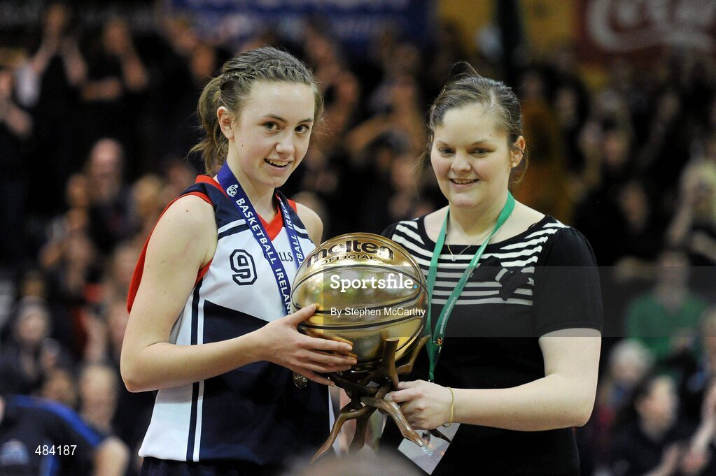 26 January 2011; Megan O'Leary, St. Vincents Secondary School, Cork, is presented with her MVP award by Louise O'Loughlin, Basketball Ireland Schools Officer. Basketball Ireland Girls U16A Schools Cup Final, Calasanctius College, Oranmore, Galway v St. Vincents Secondary School, Cork, National Basketball Arena, Tallaght, Dublin. Picture credit: Stephen McCarthy / SPORTSFILE