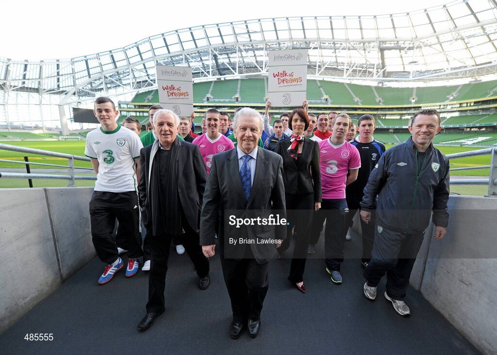 1 February 2011; The John Giles Foundation in association with 3, have launched the 'Walk of Dreams', the fundraising walk will take place on Sunday, 27th March at 3pm in 14 locations nationwide. Bringing together people who love football from all over Ireland to raise funds for the beautiful game and the John Giles Foundation, to continue the growth of football. The ‘Walk of Dreams’ will take place in Letterkenny, Sligo, Castlebar, Galway City, Ennis, Limerick City, Tralee, Cork City, Athlone, Thurles, Waterford City, Enniscorthy, Dublin City, from Aviva Stadium, and Dundalk. The John Giles Foundation was founded to use football as a vehicle for social change, to build community cohesion, increase participation and to improve health and education by providing funding to help football in clubs, schools and community groups in Ireland. Half of the funds raised will be retained by participating football clubs while the other half will go to the Foundation for community football projects in clubs, schools and community groups throughout Ireland. Visit www.johngilesfoundation.com for more details. At the launch is John Giles, joined by Elaine Carey Sales & Marketing Director with 3, Eamon Dunphy, Gerry Davis, FAS Course Co-ordinator, right, and players from clubs around the country who take part in the FAI / FAS Soccer Youth Development Course in Irishtown Stadium. Aviva Stadium, Lansdowne Road, Dublin. Picture credit: Brian Lawless / SPORTSFILE
