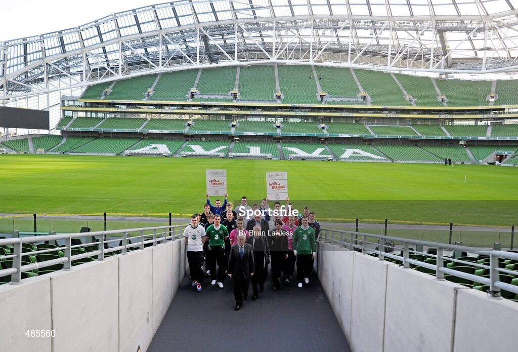 1 February 2011; The John Giles Foundation in association with 3, have launched the 'Walk of Dreams', the fundraising walk will take place on Sunday, 27th March at 3pm in 14 locations nationwide. Bringing together people who love football from all over Ireland to raise funds for the beautiful game and the John Giles Foundation, to continue the growth of football. The ‘Walk of Dreams’ will take place in Letterkenny, Sligo, Castlebar, Galway City, Ennis, Limerick City, Tralee, Cork City, Athlone, Thurles, Waterford City, Enniscorthy, Dublin City, from Aviva Stadium, and Dundalk. The John Giles Foundation was founded to use football as a vehicle for social change, to build community cohesion, increase participation and to improve health and education by providing funding to help football in clubs, schools and community groups in Ireland. Half of the funds raised will be retained by participating football clubs while the other half will go to the Foundation for community football projects in clubs, schools and community groups throughout Ireland. Visit www.johngilesfoundation.com for more details. At the launch is John Giles, joined by Elaine Carey Sales & Marketing Director with 3, Eamon Dunphy, George Hook, and players from clubs around the country who take part in the FAI / FAS Soccer Youth Development Course in Irishtown Stadium. Aviva Stadium, Lansdowne Road, Dublin. Picture credit: Brian Lawless / SPORTSFILE