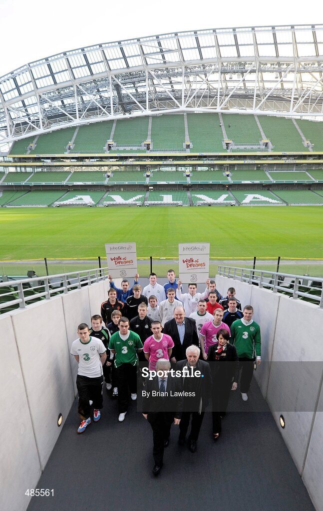 1 February 2011; The John Giles Foundation in association with 3, have launched the 'Walk of Dreams', the fundraising walk will take place on Sunday, 27th March at 3pm in 14 locations nationwide. Bringing together people who love football from all over Ireland to raise funds for the beautiful game and the John Giles Foundation, to continue the growth of football. The ‘Walk of Dreams’ will take place in Letterkenny, Sligo, Castlebar, Galway City, Ennis, Limerick City, Tralee, Cork City, Athlone, Thurles, Waterford City, Enniscorthy, Dublin City, from Aviva Stadium, and Dundalk. The John Giles Foundation was founded to use football as a vehicle for social change, to build community cohesion, increase participation and to improve health and education by providing funding to help football in clubs, schools and community groups in Ireland. Half of the funds raised will be retained by participating football clubs while the other half will go to the Foundation for community football projects in clubs, schools and community groups throughout Ireland. Visit www.johngilesfoundation.com for more details. At the launch is John Giles, joined by Elaine Carey Sales & Marketing Director with 3, Eamon Dunphy, George Hook, and players from clubs around the country who take part in the FAI / FAS Soccer Youth Development Course in Irishtown Stadium. Aviva Stadium, Lansdowne Road, Dublin. Picture credit: Brian Lawless / SPORTSFILE