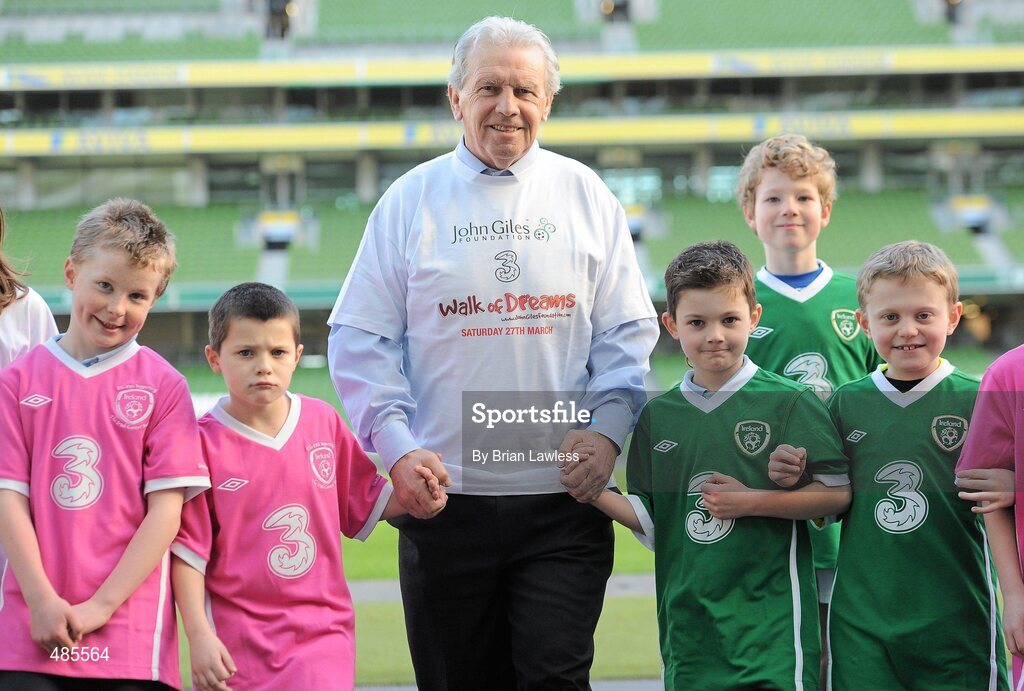 1 February 2011; The John Giles Foundation in association with 3, have launched the 'Walk of Dreams', the fundraising walk will take place on Sunday, 27th March at 3pm in 14 locations nationwide. Bringing together people who love football from all over Ireland to raise funds for the beautiful game and the John Giles Foundation, to continue the growth of football. The ‘Walk of Dreams’ will take place in Letterkenny, Sligo, Castlebar, Galway City, Ennis, Limerick City, Tralee, Cork City, Athlone, Thurles, Waterford City, Enniscorthy, Dublin City, from Aviva Stadium, and Dundalk. The John Giles Foundation was founded to use football as a vehicle for social change, to build community cohesion, increase participation and to improve health and education by providing funding to help football in clubs, schools and community groups in Ireland. Half of the funds raised will be retained by participating football clubs while the other half will go to the Foundation for community football projects in clubs, schools and community groups throughout Ireland. Visit www.johngilesfoundation.com for more details. At the launch is John Giles with, from left, Jake O'Neill, age 8, Esker FC, from Ringsend, Ross Kavanagh, age 8, Pearse Rangers, from Pearse St., Caleb Hevey, age 7, Cambridge Boys, from Pearse St., Ross O'Dea, age 8, Railway Union, from Sandymount, and Jack Allen, age 8, St. Joeys, from Ringsend. Aviva Stadium, Lansdowne Road, Dublin. Picture credit: Brian Lawless / SPORTSFILE