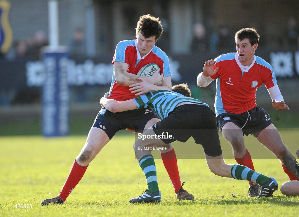 2 February 2011; David Beakey, CUS, is tackled by Dylan Simmonds, St Gerard's College. Powerade Leinster Schools Rugby Senior Cup, First Round, St Gerard's College v CUS, Blackrock College RFC, Stradbrook Road, Blackrock, Dublin. Picture credit: Matt Browne / SPORTSFILE